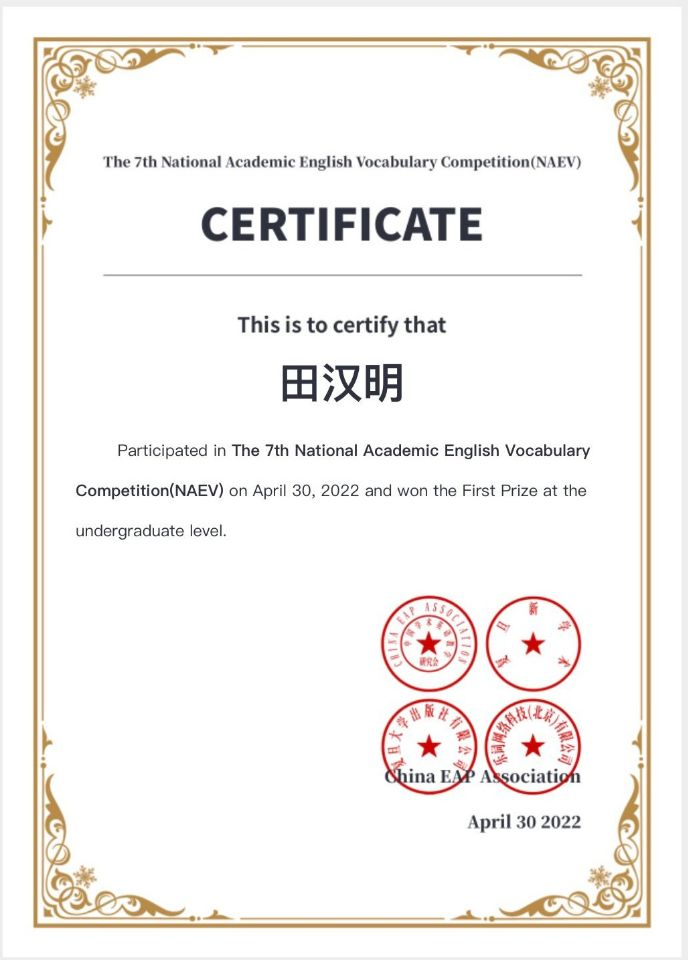 日前,由中国学术英语教学研究会和复旦大学出版社联合主办的“第七届全国大学生学术英语词汇竞赛”圆满落幕,我校学子再创佳绩,其中田汉明、苏凌钰、张超等17人荣获一等奖。优德体育网站丨中国有限公司官网牵头组织了大赛在我校的相关赛事活动,曲园学术英语协会协办。