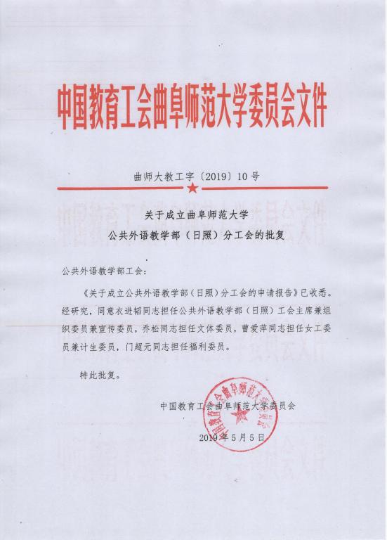 曲师大教工字〔2019〕10号关于成立优德体育网站丨中国有限公司官网优德体育网站丨中国有限公司官网(日照)分工会的批复