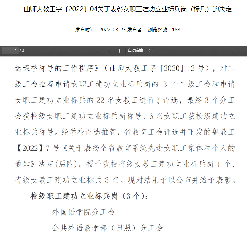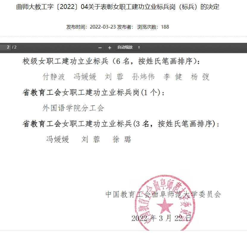 优德体育网站丨中国有限公司官网(日照)分工会荣获优德体育网站丨中国有限公司官网“校级职工建功立业标兵岗”先进集体称号;优德体育网站丨中国有限公司官网(曲阜)分工会主席李健老师荣获优德体育网站丨中国有限公司官网“校级女职工建功立业标兵”个人荣誉称号。