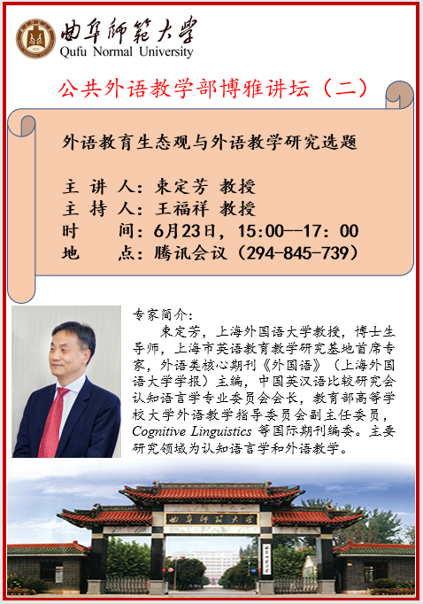 束定芳,上海外国语大学教授,博士生导师,上海市英语教育教学研究基地首席专家,外语类核心期刊《外国语》(上海外国语大学学报)主编,中国英汉语比较研究会认知语言学专业委员会会长,教育部高等学校大学外语教学指导委员会副主任委员,Cognitive Linguistics 等国际期刊编委。主要研究领域为认知语言学和外语教学。