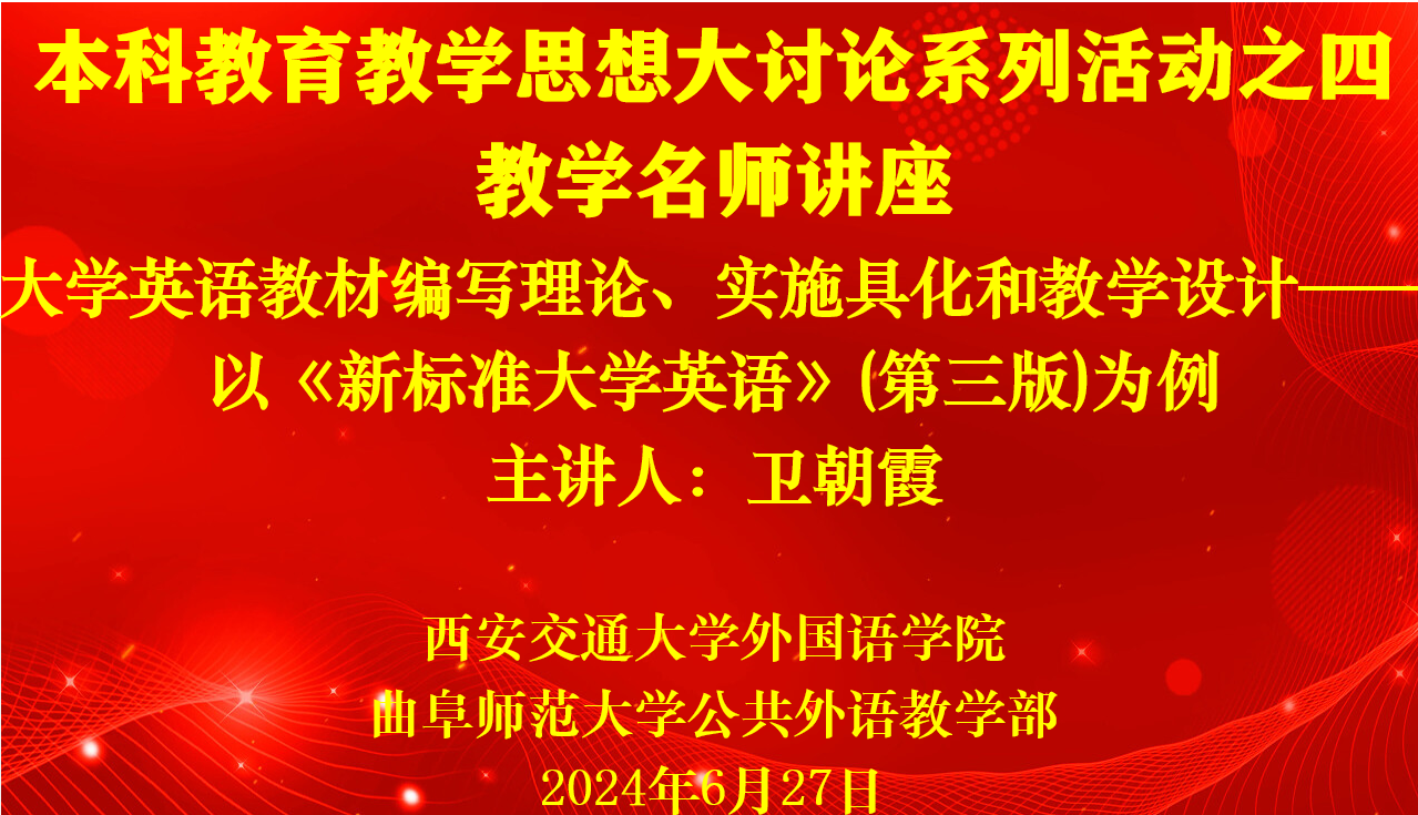 6月27日,优德体育网站丨中国有限公司官网举办本科教育教学思想大讨论系列活动之四:教学名师讲座,特别邀请西安交通大学外国语学院卫朝霞副教授作题为“大学英语教材编写理论、实施具化和教学设计——以《新标准大学英语》(第三版)为例”的专题报告。活动由优德体育网站丨中国有限公司官网主任王福祥主持,两校区全体教师参加了本次报告会。