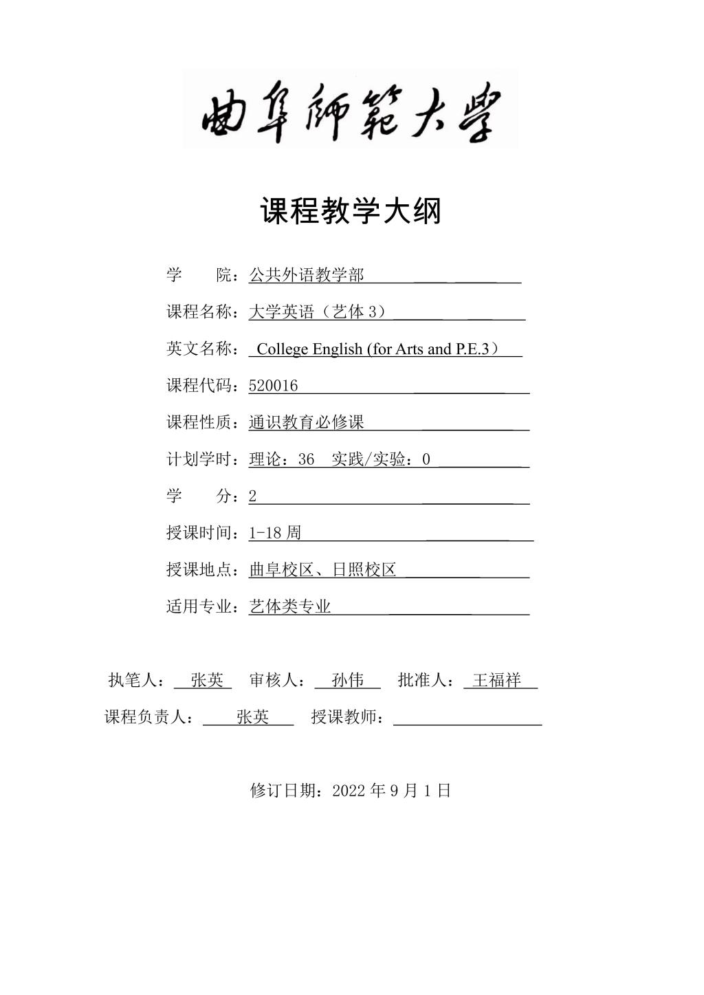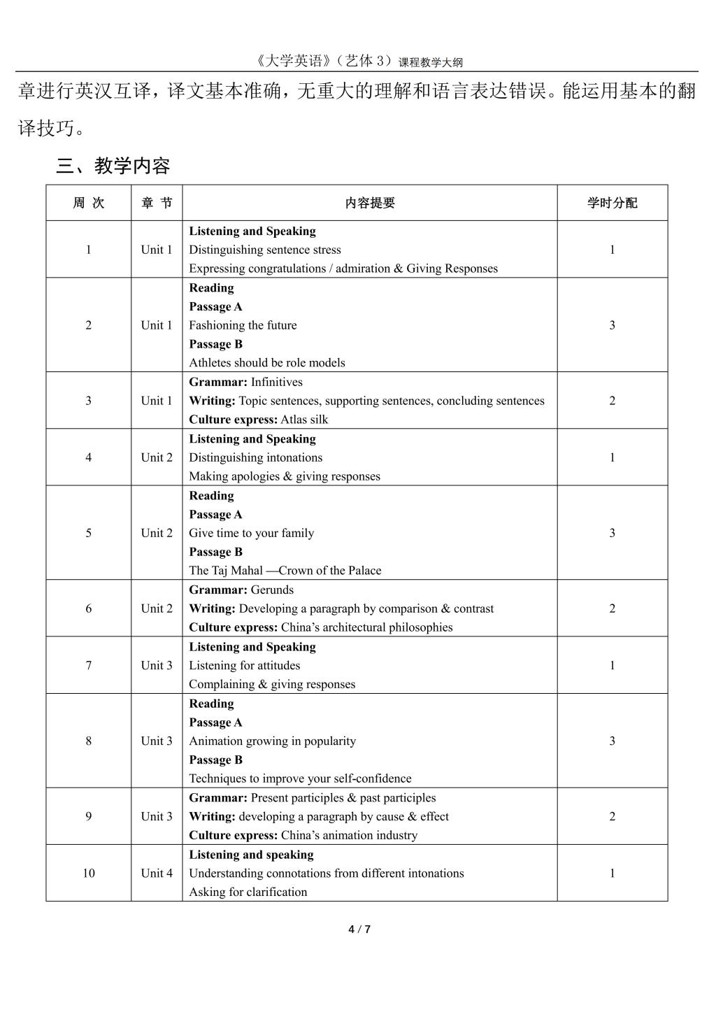 大学英语3(艺体)课程教学大纲(2022版)