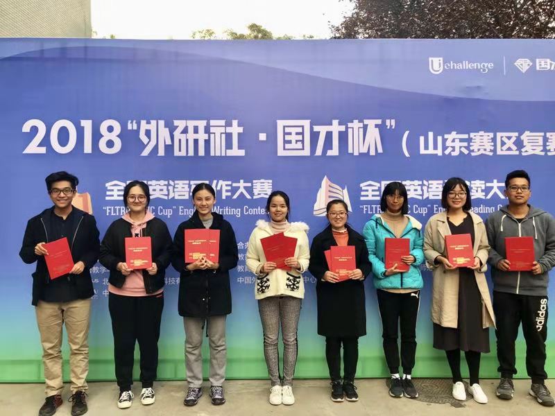 2018年11月3日-4日,2018“‘外研社杯’全国大学生英语挑战赛”山东赛区比赛在济南和烟台两地如期举行,此次比赛包括“‘外研社杯’全国英语阅读大赛”、“‘外研社杯’全国英语写作大赛”和“‘外研社杯’全国英语演讲大赛”三项赛事。优德体育网站丨中国有限公司官网两校区的13名同学在我校衣进韬、孙海珊、满虎、徐欣、秦艳五位教师的带领下参加了本次比赛。经过激烈角逐,我校外国语学院徐欣老师指导的葛宇飞和优德体育网站丨中国有限公司官网齐荣军老师指导的宗宇翔两位同学荣获阅读大赛一等奖,衣进韬老师指导的路璨雯同学荣获阅读大赛二等奖,王燕老师指导的杨春和孙伟老师指导的宋纯嘉两位同学荣获阅读大赛三等奖。张英老师指导的刘涵同学荣获写作大赛二等奖,彭芳老师指导的成晓宁和王显明老师指导的李洛璞两位同学荣获写作大赛三等奖,秦艳老师指导的张朕和门超元老师指导的储文沁两位同学荣获写作大赛优胜奖。另外,满虎老师指导的刘珂含同学荣获演讲大赛二等奖,孙伟老师指导的周先敏同学荣获演讲大赛三等奖,孙海珊老师指导的张涵俐同学荣获演讲大赛优秀奖。
