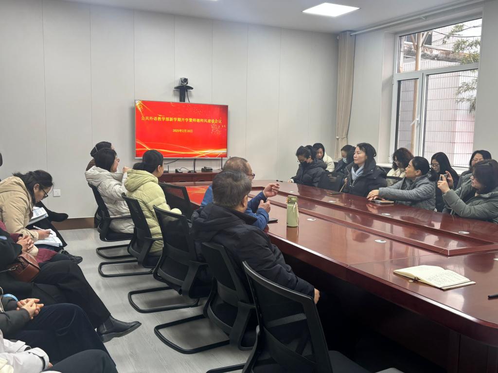 在会议第二阶段,王福祥就学校关于开展师德师风建设和校园安全工作会议精神作了全面传达,他重点对优德体育网站丨中国有限公司官网新学期思想政治理论学习、师德师风建设、意识形态管控等方面任务作了深入分析和总体部署,他强调在新学期要持续加强全体教师意识形态教育,树牢意识形态红线底线意识,深入开展师德师风建设主题教育活动,切实提升全体教师“为党育人,为国育才”使命感与责任感,增强全体教师为国弘文的荣誉感,形成甘于奉献、风清气正、乐教爱生的良好师德师风新风尚;他要求全体任课教师在日常教学工作中要时刻拉直绷紧意识形态红线,立师表,铸师魂,强化课堂管理,规范师生交往,弘扬主旋律,传递正能量。此外,结合新学期教学科研等各项重点工作,他要求全体教师要高度重视课堂教学工作,精益求精,求真务实,切实提升我校大学英语课程教学质量,扎扎实实为我校人才培养工作做好基础性支撑工作;在此基础上,切实加大科研攻关力度,认真组织好各类重点课题申报工作,积极参加各类学术会议,培育更多高层次成果,实现高质量发展。